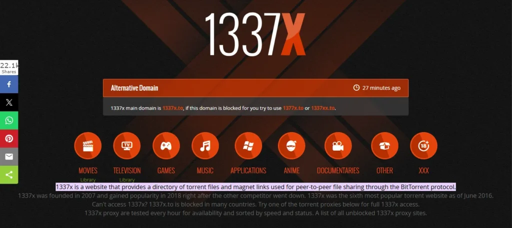 1337x is a website that catalogs torrent files and magnet links used with the BitTorrent protocol. It’s commonly described as a portal for locating pirated media and software. Access to 1337x and other torrent sites can be unstable due to domain blocks or takedown actions, technical outages, or region-based restrictions.