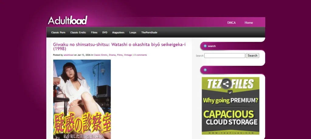 Adultload archives extensive vintage adult films and materials from the 1940s to 1990s. Conversation context highlights its categories for rips (VHS, DVD, Blu-ray), international origins (USA, France, Japan), and studios like Alpha France alongside performers such as Seka and Ginger Lynn.