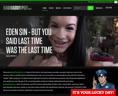 BadDaddyPov is a niche premium site focused on scripted roleplay scenes with a very specific taboo fantasy angle. The landing page looks modern and clean at first glance, with large thumbnails and a layout that feels similar to other paid adult video platforms. The overall visual style is consistent, and nothing feels outdated or broken. The first thing I noticed, however, was the presence of quite a few ads around the main content, which slightly distracts from the otherwise polished look.